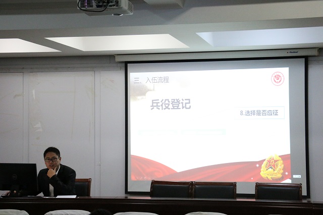 莫大贡从应征对象、优惠政策、入伍流程和注意事项四个方面向同学们解读了2016年征兵政策。他着重讲解了今年入伍的优惠政策,给大家算了一笔“经济账”和“政治账”。为了使适龄青年更好的进行兵役登记和应征入伍,莫大贡向同学们演示了整个的兵役登记的流程,从进入“全国征兵网”到“选择是否应征”,每一步都非常清晰详细。动员会结束之后,全体男生到学院机房进行现场兵役登记。