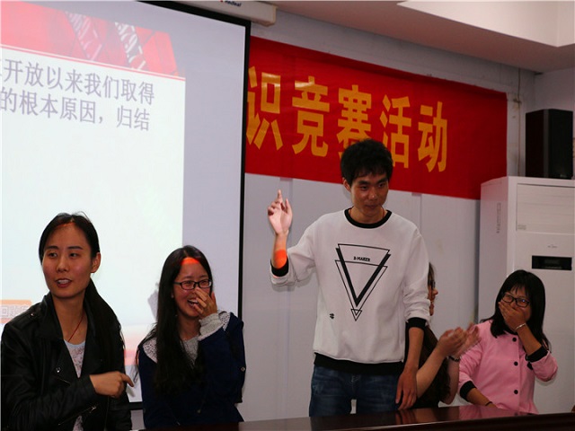 接下来的抢答环节把现场气氛推向了高潮。很多选手急于答题,提前抢答触犯规则而憾别赛场。异常激烈的比赛使各支队伍之间渐渐拉开了一定的差距,徐清同学带领的第二组、祝琳同学的第四组和何婷同学的第八组呈三足鼎立之势,远超其他小组。