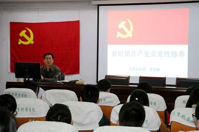 季爱新部长首先向大家介绍了党性修养的含义,为同学们能够更好地理解本期培训的内容打下基础;随后,他旁征博引、深入浅出,联系大量历史事实,重点分析了党性修养的本质内涵,幽默风趣的语言不断将现场氛围推向高潮。紧接着他结合党的成长历史以及书籍《苦难与辉煌》明确阐述党性修养是加强党员队伍建设的需要,是经受长期执政考验的需要,是面对不断改革开放的需要,受到在场学员热烈反响。最后,季部长从“学习求知为第一途径,投身实践为根本途径,党内生活为特殊途径”三者相结合对学员党性修养的提高提出要求。党课最后,季老师希望同学们要进一步坚定学生党员的理想信念,明确责任担当,坚持学以致用、学用相长,不断提高与时代发展和事业要求相适应的素质能力,努力成为一名优秀党员。
