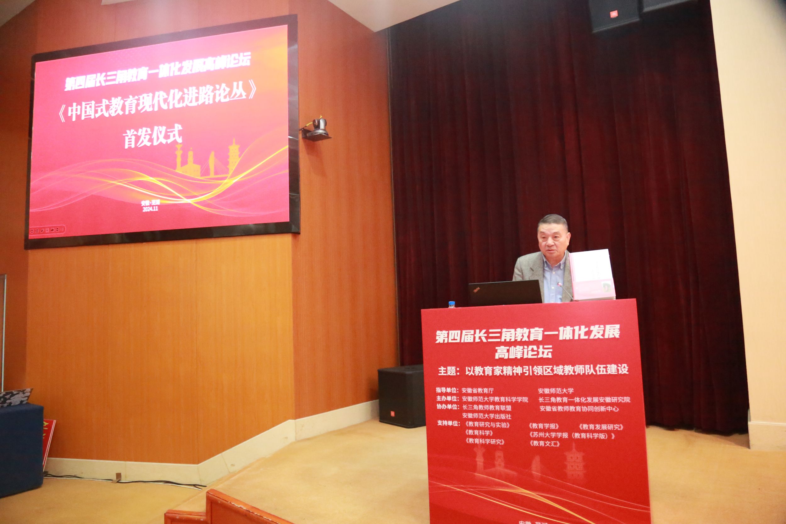 首发式上,丁钢教授代表与会学者专家致辞。他指出,《中国式教育现代化进路论丛》四卷本不仅集阮成武教授多年研究成果之大成,也是安徽师范大学教育学科团队长期耕耘教育政策研究的标志性成果。该丛书取得以下几方面特色和成就:第一,这是一项跨越时间长河的研究,与中国式教育现代化的实践探索同步,既有对历史的深刻反思,又有对现实的深入研究和对未来的前瞻性思考,只有长期深耕于教育理论研究的学者,才能积累出如此具有时代感和含金量的学术成果。第二,研究主题聚焦而视野开阔,不仅涉及中国式教育现代化的战略定位,还深入到基础教育、高等教育和教师队伍这三个关键领域,是目前国内最为系统的一套中国式教育现代化研究力作。第三,丛书最大特色是以“进路”为突破口,对中国式教育现代化这一宏大话题进行学术破题和学理阐述,将中国式教育现代化从道路选择转向具体的实践进路,对促进中国教育学学科体系、学术体系和话语体系建设做出了重要贡献。