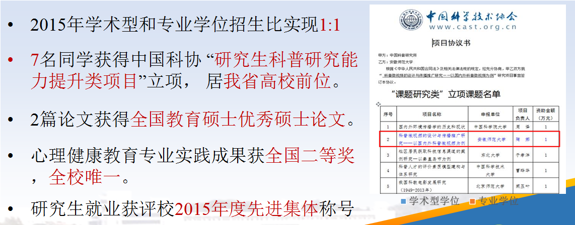 教育技术学、应用心理学专业分别获批2015年省级质量工程项目“省级综合改革试点专业”、“省级专业结构优化与专业改造项目”立项。至此,教育学、心理学、学前教育等5个本科专业全部实现了省级以上高端建设平台全覆盖。