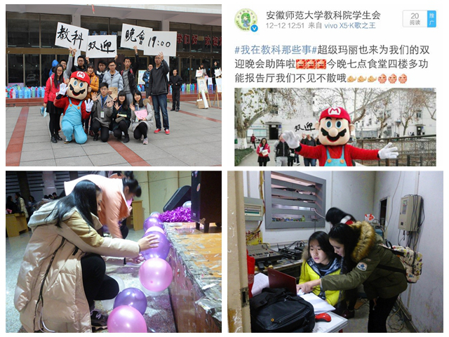 晚会开展前夕,院会同学通过微博平台的互动和马里奥玩偶游校,线上线下全面宣传晚会。同时,晚会前的会场布置工作也在有条不紊的进行着,为同学们营造温暖而富有教科院特色的会场气氛。