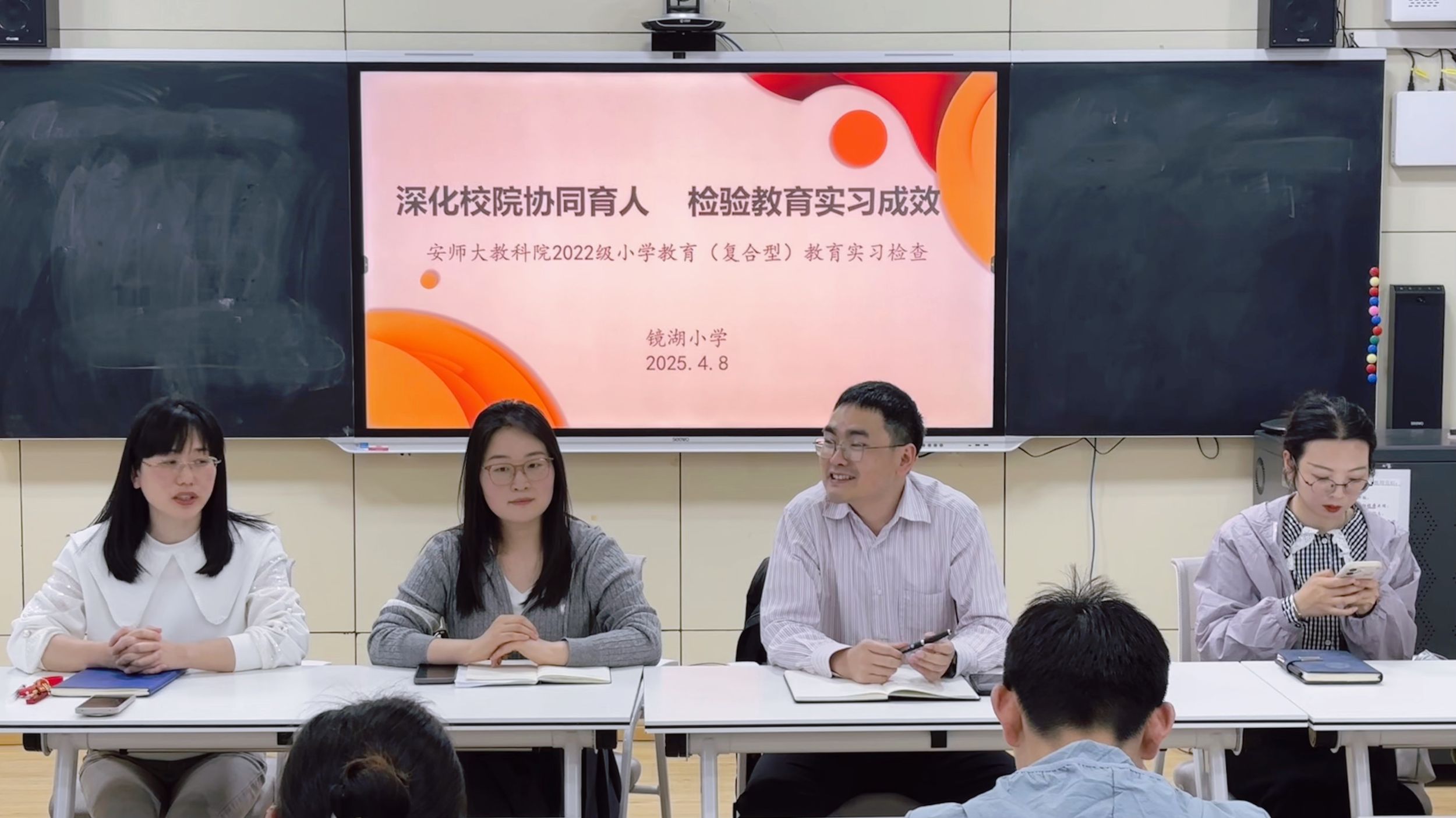 为深化校院协同育人机制,强化教育实习过程管理,4月8日下午,365英国上市官网副院长韩建涛一行赴芜湖市镜湖小学开展2022级小学教育(复合型)专业实习中期检查。检查组成员包括专业负责人陈娜、实习指导教师胡微,镜湖小学教导处副主任刘琳主持会议,10名实习生及带教教师代表参会。