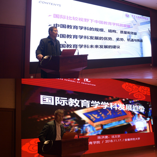 简短的开幕式结束后,国务院学位委员会第七届教育学科评议组成员石中英教授和陈洪捷教授分别作了《中国教育学学科发展报告》和《国际教育学科发展趋势》两个主题报告。石中英教授从国内教育学科的比较分析、国际比较视野下的中国教育学科发展、中国教育学科的规模、结构、质量和效益及未来发展建议等方面分析了我国教育学科发展的基本情况。他指出,教育学科的发展要汇聚合力,建设更加广阔丰富的教育学科;抢抓机遇,建设更加开放融合的教育学科;要内涵发展,扎根实践,建设具有中国特色、服务本土发展的教育学科。陈洪捷教授的报告回顾了教育学科发展的基本历程,并分析了教育学科发展过程中的软性革命、跨学科融合、研究范式的变迁、国家差异和面临的共同问题。