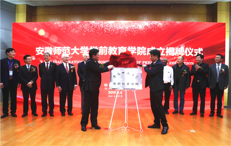 本网讯(文/教科院 孟庆娟 图/党委宣传部 张鑫)四月芳菲春意浓,高朋满座幼教兴。4月4日下午两点,伴随着美丽的幼教天使们欢快的舞蹈和激扬的歌声,安徽师范大学学前教育学院成立揭牌仪式在赭山校区田家炳教育书院三楼报告厅隆重举行。校党委书记顾家山,芜湖市教育局党委书记、局长江汛,安徽商贸职业技术学院院长李忠,校党委常委、宣传部部长胡靖,中国学前教育研究会学前教育基本理论专业委员会主任、华东师范大学博士生导师刘晓东,特邀嘉宾美国布莱诺大学校长Edward Schrader、董事会主席Peter Miller、教育学院院长Eugene Williams,以及国内外学前教育领域的专家学者,省内兄弟院校教育学院院长、学前教育系主任,省内各地市学前教育教研员代表、幼儿园园长代表,安徽师范大学各职能部门领导、365英国上市官网领导和学前教育专业全体师生参加了揭牌仪式。仪式由校党委常委、副校长朱家存主持。