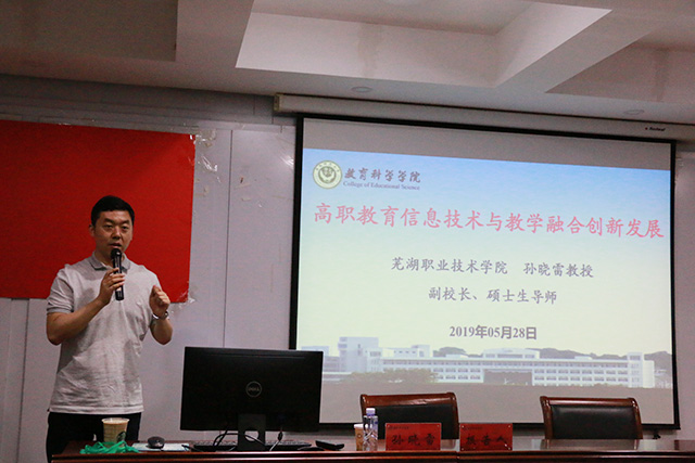 本网讯(文/刘媛媛 图/朱瑞)5月28日下午,芜湖职业技术学院副校长、教授孙晓雷应邀在我院三楼学术交流中心作了题为“高职院校信息技术与教学融合创新”的学术报告。报告由我院科研与研究生工作分管院长聂竹明主持,教育学相关专业师生到场学习。