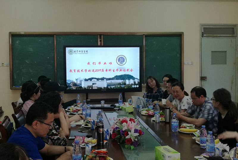 本网讯(文/席鹏 图/陈思宇)时光荏苒,岁月如歌。6月12日下午,教育技术学专业在学院四楼会议室召开话别会,祝贺2019届教育技术专业本科学子毕业离校,意气风发踏上新征程。会议由专业负责人张克松主持,院党委副书记张如华,副院长聂竹明,毕业生辅导员莫大贡,教育技术学专业十多位老师及19届毕业学子参加了会议。