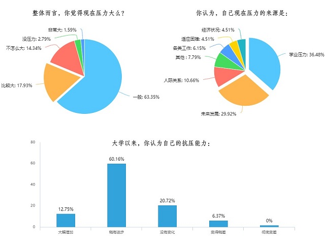 为深入了解我院学生对“在挫折中奋起 在压力中成长”这一主题的基本认识和现状,在心理学专业教师指导下,学院发展辅导站设计并发放了一份关于“压力与挫折”的调查问卷。该调查基于线上的问卷星平台,主要聚焦于当下学生自身压力的感受情况及受挫折的程度、来源、影响、解决途径等方面。数据化地呈现出学生在“减压抗挫”问题上的现状,帮助发展辅导站更为精准地掌握学生的问题,也让学院采取的措施更加体系化和全面化。院团委结合学生的反馈,精心设计减压抗挫知识的展板,帮助同学们提升问题防范能力,增强心理健康素质。