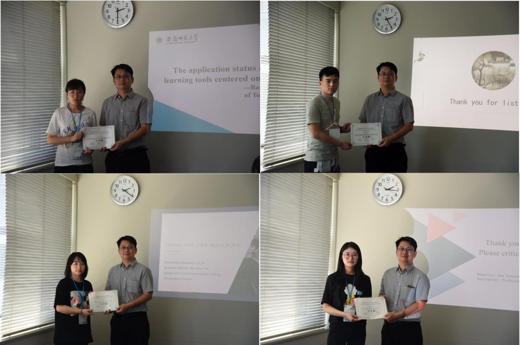 在论文发表汇报环节,我院四名研究生分别进行了相关主题汇报。分别有张高亮同学的《The application status and enlightenment of smart phones in college classroom learning》,利用问卷调查的形式探寻大学生在课堂学习中使用手机学习的现状,分析现在大学生在课堂使用手机的基本情况以及态度,对智能手机更好的融入当代课堂有一定的借鉴启示;孙岩岩同学的《Research on the Integration Mode of Digital Broome Education APP and Classroom Teaching》,基于数字布鲁姆选择出适用于不同布鲁姆认知目标的若干信息化工具用于教学中,探讨教育APP与课堂教学的融合模式;盛婕同学的 《The application status and reflection of learning tools centered on learning activities---Based on the ranking analysis of Top100 learning tools in 2018》,通过对2018年学习工具排名的分析,梳理出学习工具应用的发展现状和演变趋势,总结、分类和反思学习工具在文献研究中的应用方法,最后在学习活动中构建学习工具应用程序模型;蔡锦同学的《What kind of educational technical ability are Chinese normal university students cultivating? -- based on the analysis of educational technology teaching materials》,从教材分析的角度,选取了十所师范类大学的教育技术学公共课程使用的教材,用文本分析法对其进行对比研究,试图回答“师范生正在学习怎样的教育技术学”这样的问题。