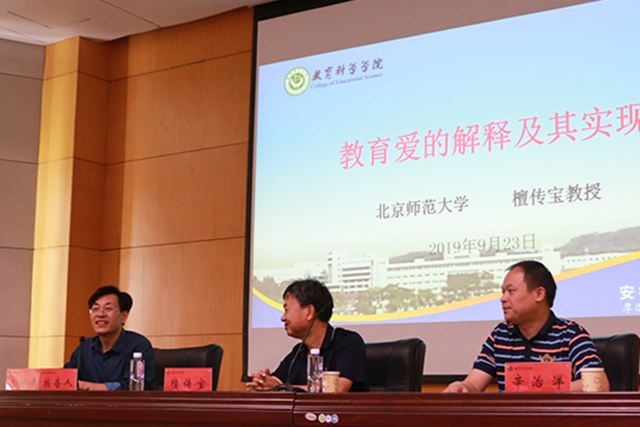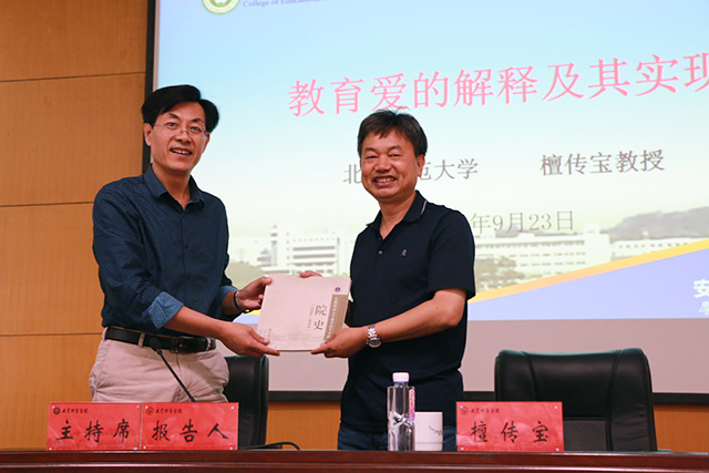 本网讯(教科院 文/张旭航 图/姜惠玲)9月23日上午,我院兼职教授、北京师范大学教育学部博士生导师檀传宝教授应邀来我校做客“文津论坛”,在赭山校区田楼报告厅为我院师生做了题为“教育爱的解释及其实现”的学术报告。报告由辛治洋教授主持,200多名师生出席报告会。报告会开始前,学院院长桑青松教授向檀传宝教授赠送了我院院史。