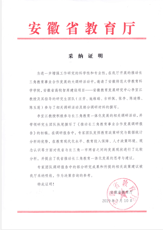 李宜江教授积极参与长三角教育一体化发展的相关调研活动,并带领研究生团队执笔撰写了《推动长三角教育事业合作发展调研报告》的初稿。在调研报告中,专家团队发挥教育政策研究与数据统计分析的优势,在教育现代化水平、教育投入保障、人才政策环境、观念认识等方面对我省与长三角一市两省之间的发展现状进行了比较分析,并提出了推动长三角教育一体化发展的思考与建议。专家团队调研报告中的部分研究成果和所提的相关政策建议被教育厅采纳吸收,并出具了采纳证明。