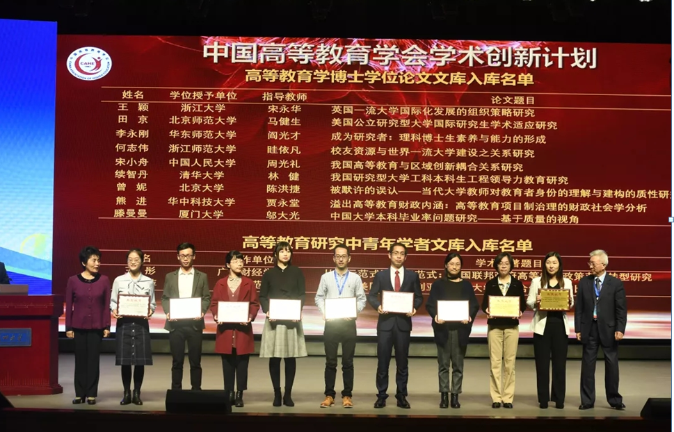 10月11—13日,滕曼曼应邀参加在甘肃兰州召开的“2019高等教育国际论坛年会”。闭幕式上,中国高等教育学会姜恩来秘书长宣读了“中国高等教育学会学术创新计划——高等教育学博士学位论文文库”的入库名单,中国高等教育学会林蕙青副会长(原教育部副部长)、管培俊副会长为入库作者颁发纪念牌。