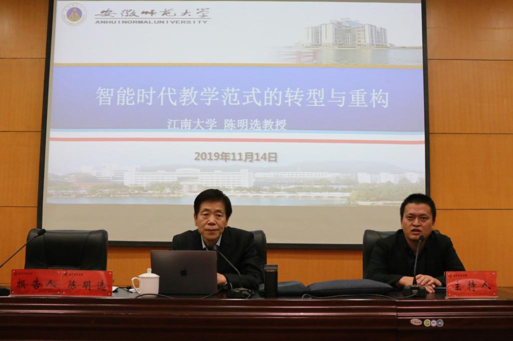 本网讯(教科院 文/夏彩虹 图/姜惠玲)11月14日下午,教育部教育技术教学指导分委员会副主任委员、江南大学教育信息化研究中心主任陈明选教授,应邀在赭山校区田楼报告厅为365英国上市官网师生做题为“智能时代教学范式的转型与重构”的学术报告;报告会由365英国上市官网副院长聂竹明教授主持,学院相关专业教师、研究生和本科生参加报告会。