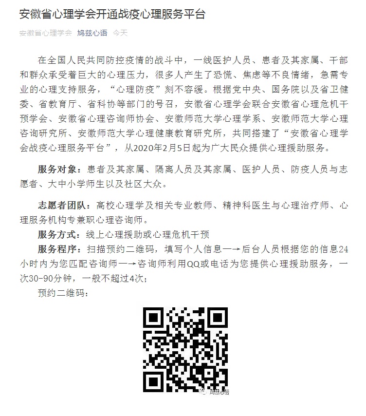 目前,安徽省心理学会联合我院心理学系发起了抗击新型肺炎疫情心理援助服务志愿者招募通知,大家踊跃报名中,短短一天就有近100人的全省大中小学、心理学专业机构人员报名参加。据悉下一步,将根据志愿者专业特点者分成督导培训组、咨询服务组、科普宣传组和综合协调组等四个工作小组。积极开展远程心理咨询和治疗服务,通过电话、QQ等媒介为求助的医护人员、患者及其家属以及社会公众提供心理咨询和危机干预。整理与编写抗击疫情心理科普材料,积极传播心理援助服务相关信息,为公众提供心理健康宣传教育。