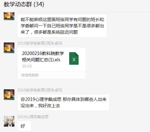 教学监控网络化全覆盖,全面收集教学中出现的问题及时进行反馈。一是教学办组建了由各班班长参加的微信群,同学们可以在群里反映各课程的线上授课准备情况、授课过程中出现的问题等,由教学办汇总进行研判,分头交给教务处和超星技术人员处理。二是通过各专业负责人了解各专业教师的授课情况、教学建议等,及时处理并反馈,确保线上教学工作顺利进行。另外,学院将于近期针对个别技术困难教师开展线上授课的技术辅导工作。三是严格教学微信群、QQ群的管理,落实群主管理责任,邀请辅导员入群协助管理,严格核实所有成员身份,严格落实实名制度,严格入群批准验证,杜绝陌生人随意入群现象。