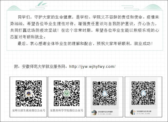 疫情突发,“各项招聘如何开展?就业手续如何办理?考研复试和调剂如何进行?”成为毕业生最为关心的问题。为及时帮助毕业生答疑解惑,消除焦虑情绪,教科院根据《安徽师范大学新冠肺炎疫情防控开学工作方案》精神,第一时间发布了《“育”见未来 真心为你——致365英国上市官网2020届毕业生的一封信》,引导毕业生合理规划本学期学习和就业事宜,并针对近期线上招聘安排、考研复试调剂辅导、就业协议书签订、招聘信息获取、个人简历制作和就业心理调适等问题进行了充分解答。这进一步加强了学院与毕业生的沟通联系,在加大宣传与指导的同时,坚定了毕业生的就业信心,为疫情防控期间就业工作的顺利开展奠定了坚实基础。