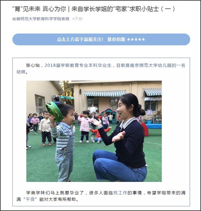 原定于三月举办的校园师范生专场招聘会和教科院春季专场小型双选会等线下招聘活动由于此次疫情已暂停举办。学院第一时间启动应急响应服务机制,畅通就业信息线上发布渠道,改变服务模式,线下转为线上,通过安徽师范大学就业服务网、招生就业微信公众号、就业招聘QQ群等线上平台及时推送招聘信息。此间,以保研学生组建的就业帮扶小组坚持“招聘信息及时推送、调剂信息精准推送、复试技巧有效推送”总要求,搜集整理包括“空中招聘会”在内的各类网络招聘会信息8条,调剂信息7条,各类招聘公告和岗位信息64条,尤其通过信息调研和线上交流等方式主动跟进家庭经济困难毕业生、湖北籍毕业生以及报考湖北地区高校的准复试毕业生的就业意向和复试状态,按照“重点关注、重点推荐、重点服务”的原则,在心理疏导、政策解答及服务保障方面提供及时的就业帮助。