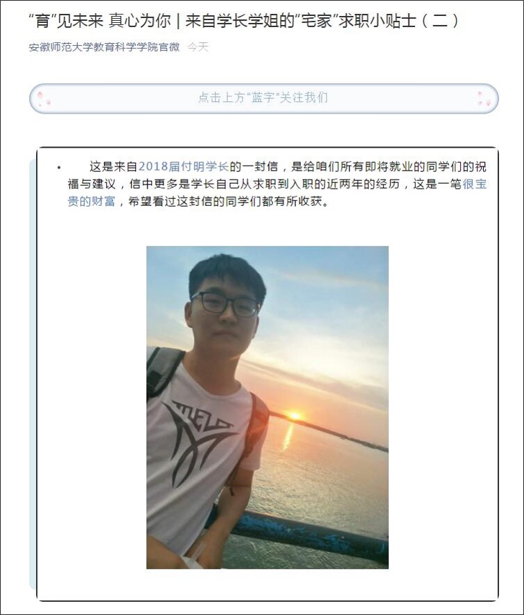此次疫情爆发期间,已毕业的历届教科学子成为最宝贵的服务资源。学院专门组织优秀校友开展就业帮扶活动,通过视频讲技巧、微信谈经验,书信说方法,帮助各专业毕业生增强就业技能。优秀校友结合亲身经历线上说法,给大学生进行职业生涯规划教育和就业指导,为毕业生求职“指点迷津”,受到普遍好评。毕业生们纷纷表示“在这样一个特殊时期能够得到学长学姐的帮助非常开心,定将脚踏实地,把握机遇,顺利就业,今后感恩母校、回馈社会。”截至目前,共有来自各专业的21名优秀毕业生提供就业帮扶类文章24篇,学院也将通过微信公众号和就业帮扶QQ群陆续推送。