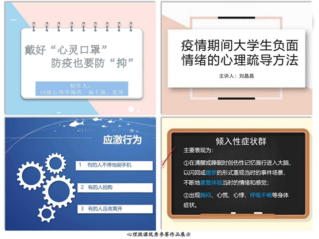 比赛要求学生自己制作课件并录制线上微课,普及心理健康知识,以达到心理疏导的目的。心理学专业的同学们积极参与,分别从不同角度为大家解读了疫情期间心理状态变化的原因及改善方法,传递正能量。18级心理学钱俊妮同学进行了简单的心理知识科普,讲解了焦虑等负面情绪产生的原由与大致过程并强调这是一种正常的现象;18级心理学的陶芮、储千禧、王坤同学合作,以“带好心灵面具,防疫也要防抑”为主题阐述了疫情期间人们心理遭受打击的严重程度,表明了心理健康问题的重要性;而17级应用心理学刘晶晶同学系统性地介绍了关于负面情绪自我疏导的步骤以及有效缓解消极精神状态的妙招,包括自我暗示、转移注意力等实用的方法;17级应用心理学梁惠焯同学更是强调从长远的角度上来看,学生需要构建心理防线才能在以后的生活中面对类似的情况更加游刃有余地对待。参赛选手们从不同的切入点分析了此次疫情可能导致的负面情绪,并从专业知识的角度对各专业同学的过去、现在、未来的心理进行了分析并提出意见。