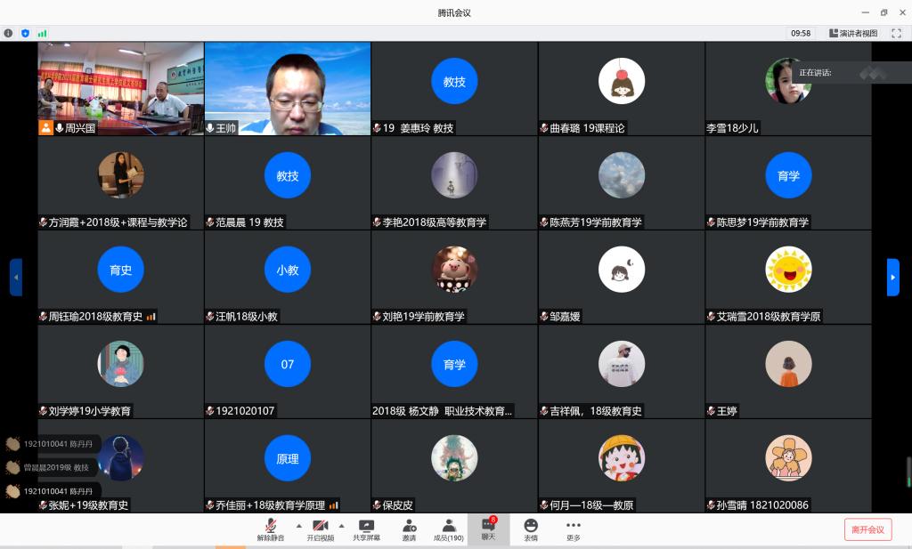 本网讯(教科院 姜惠玲)为拓宽学生学术视野,引导学生探索新知,6月5日下午,华中师范大学博士生导师王帅教授应邀开讲,依托腾讯会议平台为我院师生带来了一场主题为“回归教育的常识:以五育为例”的线上讲座。讲座由我院周兴国教授主持,教育学专业教师及研究生共近200人在线聆听。