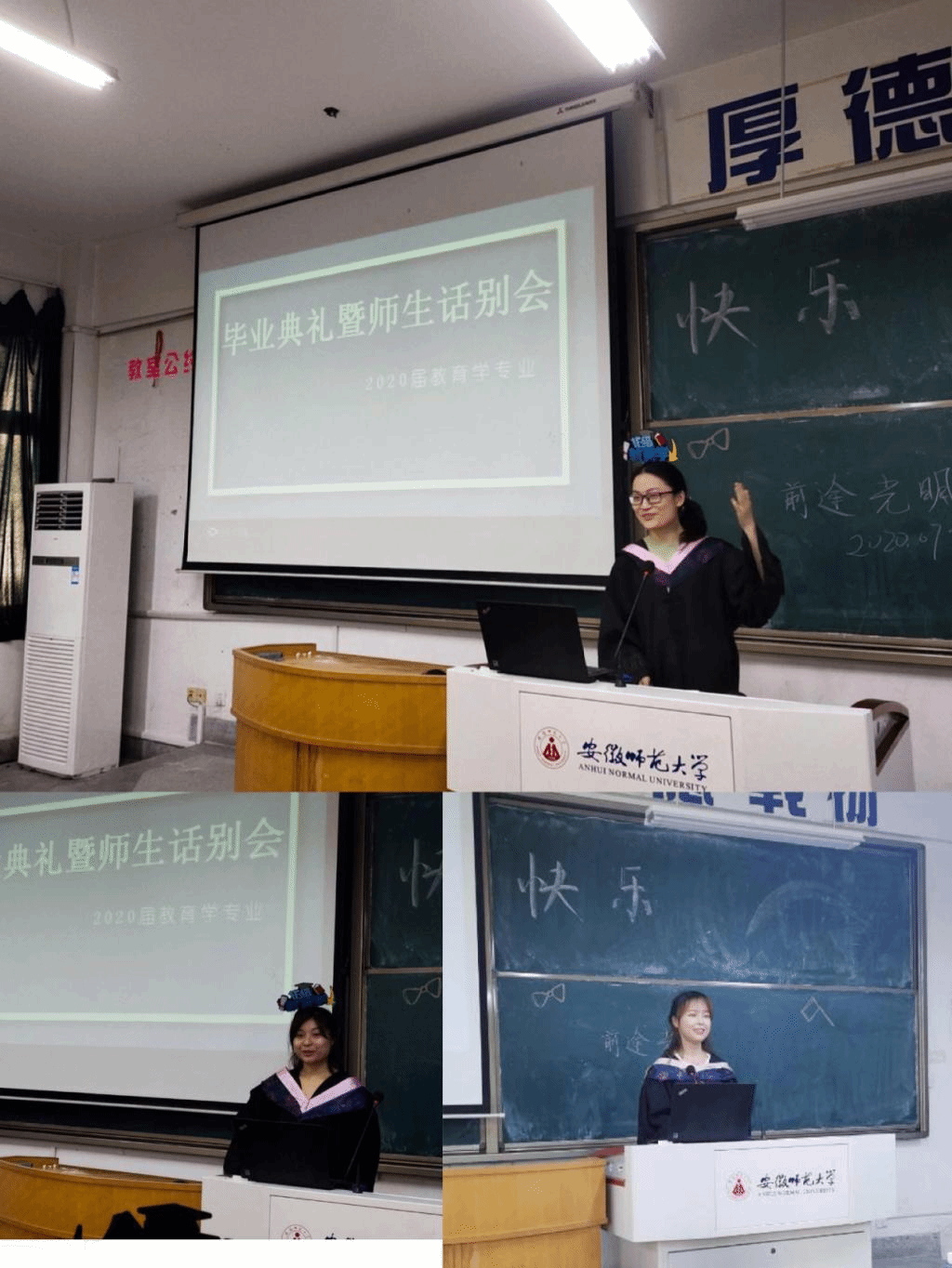 四年时光悄然无息地过去,我们告别了曾经的青涩与懵懂,即将步入社会。无论我们今后是读研还是走上工作岗位,我们都永远不会忘记在安徽师范大学教育学的四年。专业教会了我们做人做事要懂得规范,怎样与他人合作协调以及教我们如何去做一个优秀的教育者。这里有许多我们可爱的老师,不仅向我们传授知识,还培养我们的品德与能力,让我们成为德才兼备的人。天下无不散之筵席,往后的校园里可能不再有我们的身影,但我们在荷园之中定格的青春,还有故事,将在他乡静静地诉说。本次毕业典礼暨师生话别会增进了教育学专业师生的感情,老师们的临别祝福更是激励着每一位同学奋发向上,走出更加宽广的人生道路。