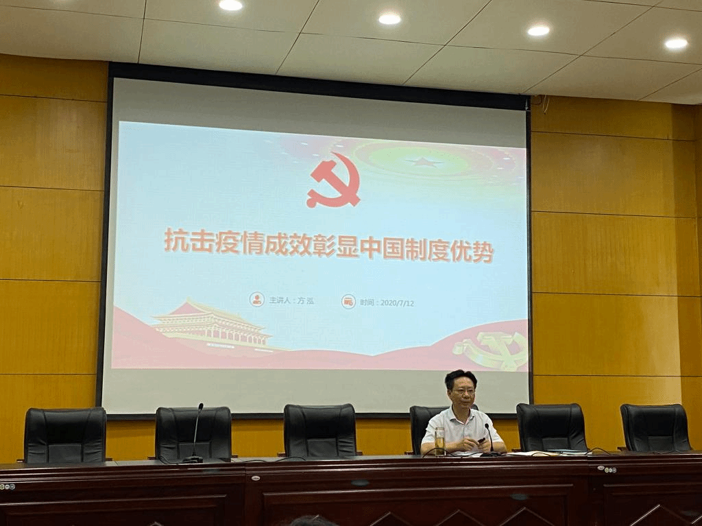 会上,方泓作了题为《抗击疫情成效彰显中国制度优势》的学习报告。方泓在报告中通过我国取得抗击疫情阻击战重大战略成果与西方国家特别是美国疫情至今仍在不断扩散蔓延的情况对比,指出这场抗击疫情的特殊实践充分彰显了中国制度优势;方泓从党的领导、思想引领、举国体制、文化激励、人民战争等五个方面,具体分析阐述了中国制度优势在我国抗击疫情斗争中所发挥的巨大作用,强调中国制度符合中国实际、具有中国特色、体现中国人民意愿,是世界上最能给中国人民带来福祉和利益的好制度;他要求全院教职工要进一步坚定制度自信,立足岗位努力奋斗,为夺取疫情防控和实现经济社会发展目标“双胜利”、为如期完成全面建成小康社会任务、为实现中华民族伟大复兴做出应有的贡献!
