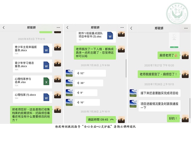 教科院郑筱妍副教授担任“全心全益•心灵护航”暑期调研团队指导老师,她多年从事心理学、团体心理辅导、心理咨询实务与青春期心理辅导课程的教学,在对学校心理健康教育与团体心理辅导的研究中掌握了精深的心理学知识,能够有效指导对留守儿童主观幸福感与学业倦怠课题团队的调研。郑筱妍副教授及时跟进调研进程,结合实际情况,为团队工作过程中的问题提出有效建议和对策,同时鼓励学生实事求是,全力完成此次暑期调研项目。