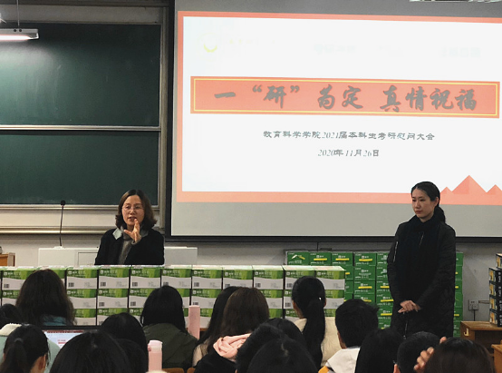 本网讯(教科院 张旖馨)距离2021年全国硕士研究生招生初试考试还有一个月的时间,对于考研学子们来说,这段时间是最后的冲刺阶段。为给他们加油鼓劲,送去祝福,2020年11月26日上午,学院在田楼8103教室召开了2021届毕业生考研慰问大会。学院党委书记方泓、院长李宜江、党委副书记张如华、行政副院长何海燕、毕业班辅导员谭茹轩,以及2021届100多位考研学子共同参加了此次活动。