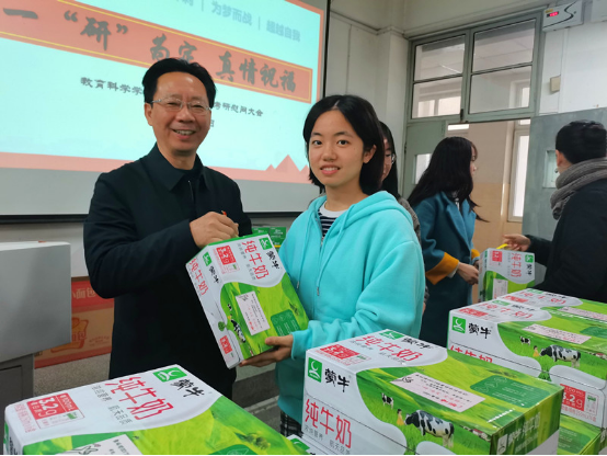 随后,学院领导老师为同学们发放了考研慰问品。一箱箱牛奶、一袋袋面包、一盒盒饼干寄托着学院对考研学子们的关怀与祝福,在寒冷的冬天里,为奋战在考研路上的同学们送去了一份暖心的问候。