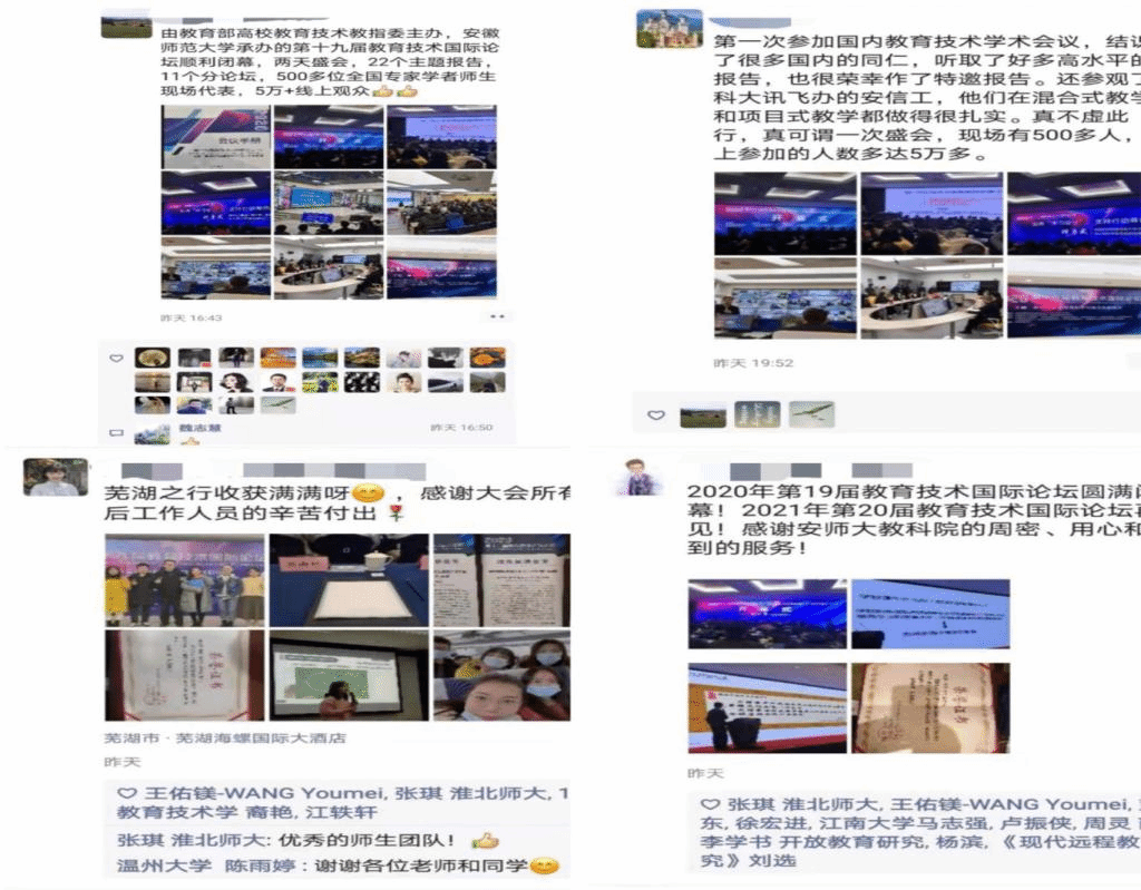 教育部高等学校教育技术专业教学指导委员会主任、广东工业大学党委书记胡钦太教授称赞道:“为期两天的论坛克服疫情重重困难,组织严密、形式新颖,不管是会务、食宿的安排,还是报告活动的组织,安师大教科院都提供了细致入微、热情周到的服务,感谢会议承办方的辛勤付出”。教育部教育技术专业教学指导委员会副主任委员陈明选教授对我院成功举办本届教育技术论坛表示祝贺:“本次论坛报告多、干货多、收获多,围绕不同主题,开展了116场主题报告,为我们提供了充分交流的机会。”扬州大学新闻与传播学院院长冯锐教授说道:“本次论坛规模宏大、大咖云集、特色彰显,是教育技术学科领域的一次学术盛宴,感谢365英国上市官网为本次国际论坛召开的大量细致的筹备工作。”教师代表滁州学院李国峰表示:“安师大细节做的特别好,如精美的会议手册、丰厚的论文集、独特的纪念品、PPT、线上直播等,这是师大会务工作人员辛勤工作、细心组织的结果。”华南师范大学学生代表们说道:“有幸参与此次论坛,聆听了众多专家的独到见解,芜湖之行,收获满满。”据统计,会议工作组的老师和学生共收到感谢反馈信息300余条。