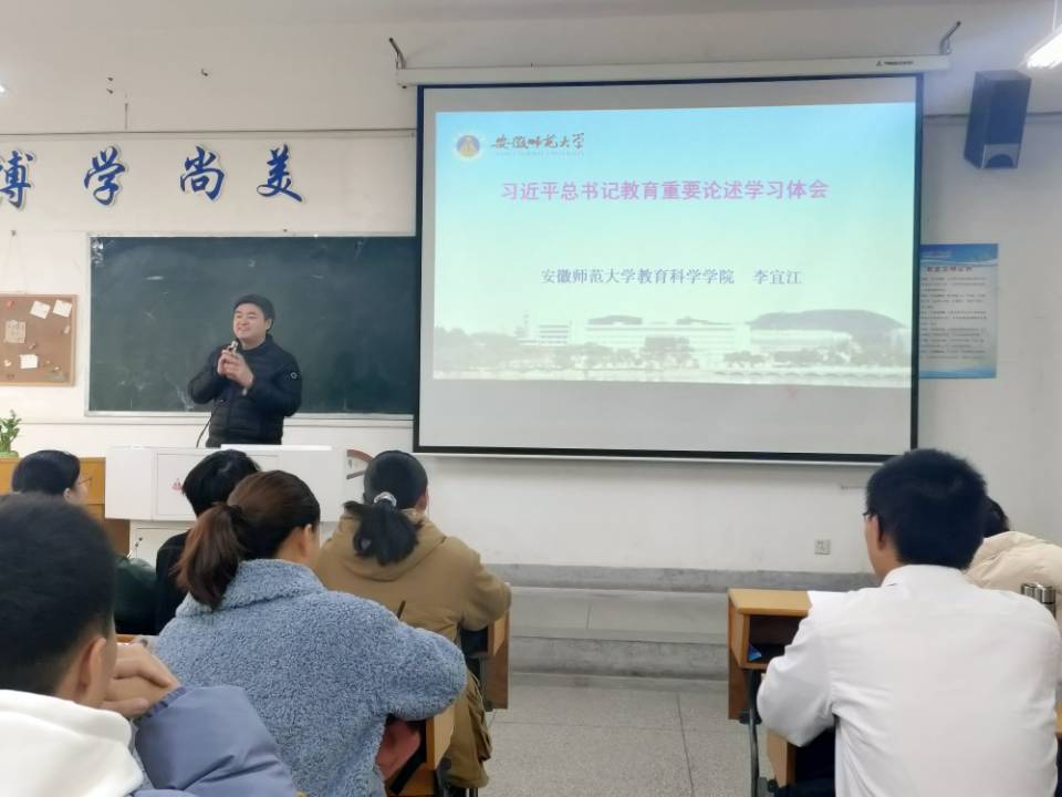 习近平总书记提出“幸福都是奋斗出来的”,李宜江以此勉励同学们作为人民教师要在教书育人的岗位上辛勤耕耘和付出,这样才能获得教师的幸福感。结合小学教育专业为乡村小学定向培养师范生的特殊性,李宜江鼓励同学们在大学这样一个崭新的平台应脚踏实地、如饥似渴的学习相关知识,不断提高自身的综合素质,为振兴乡村教育,改变家乡落后的教育现状贡献一份自己的力量。李宜江的授课情真意切、字字珠玑,言语间充满了对同学们的期望。在上了这一堂与众不同的形势与政策课后,同学们纷纷表示,此次专题学习内容丰富,受益良多,大家加深了对习近平教育思想的了解,也进一步明确和坚定了作为师范生的使命和职责。