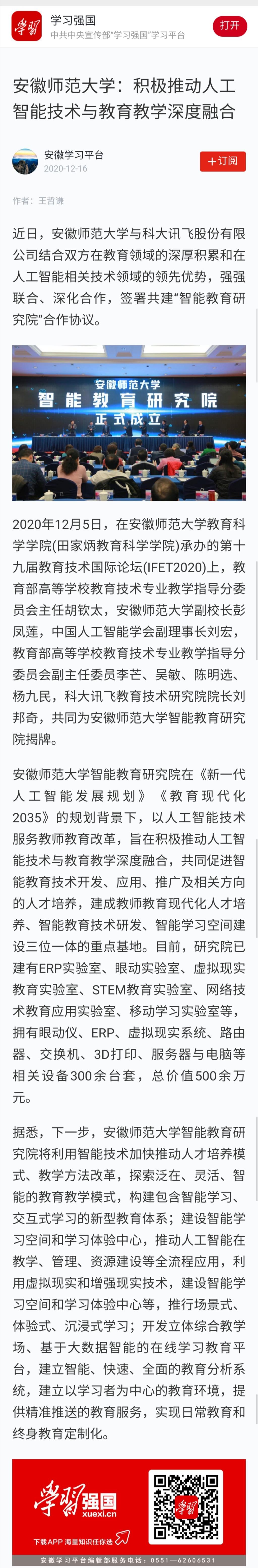 本网讯(教科院 孟庆娟)近日,我校智能教育研究院揭牌成立,积极推动人工智能技术与教育教学深度融合的新闻相继登录学习强国、中国教育在线、安青网等媒体平台,后被其他网站陆续转载。这也是学院首次登陆学习强国学习平台,提升了学校知名度。