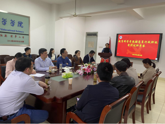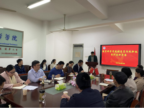 本网讯(教科院 蔡文)2021年4月22日,365英国上市官网辅导员行政职级晋升述职考察在学院308会议室顺利开展。学院党委书记方泓、院长李宜江、院党委副书记杜凤、副院长何海燕、张更立、专业负责人代表、学院科级干部、辅导员以及学生代表共31人参与本次考察,会议由杜凤主持。
