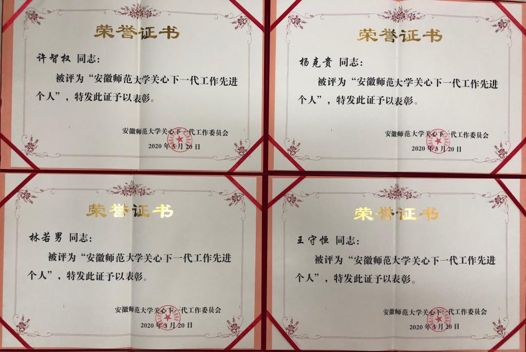 本网讯(教科院 张莉)3月20日,校关工委对关心下一代先进集体和先进个人予以表彰,教科院关工委荣获“安徽师范大学关心下一代工作先进集体”荣誉称号,林若男、王守恒、许智权、杨克贵同志分别获评“安徽师范大学关心下一代工作先进个人”。
