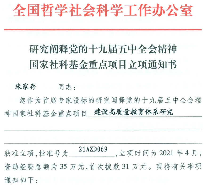 本网讯(教科院)近日,接全国哲学社会科学工作办公室立项通知,我院朱家存教授申报的研究阐释党的十九届五中全会精神国家社科基金重大项目转为重点项目立项,立项后的项目名称为“建设高质量教育体系研究”,项目批准号为21AZD069,资助经费为35万元,这是我校获批立项的第5项国家社科基金重大转重点项目。