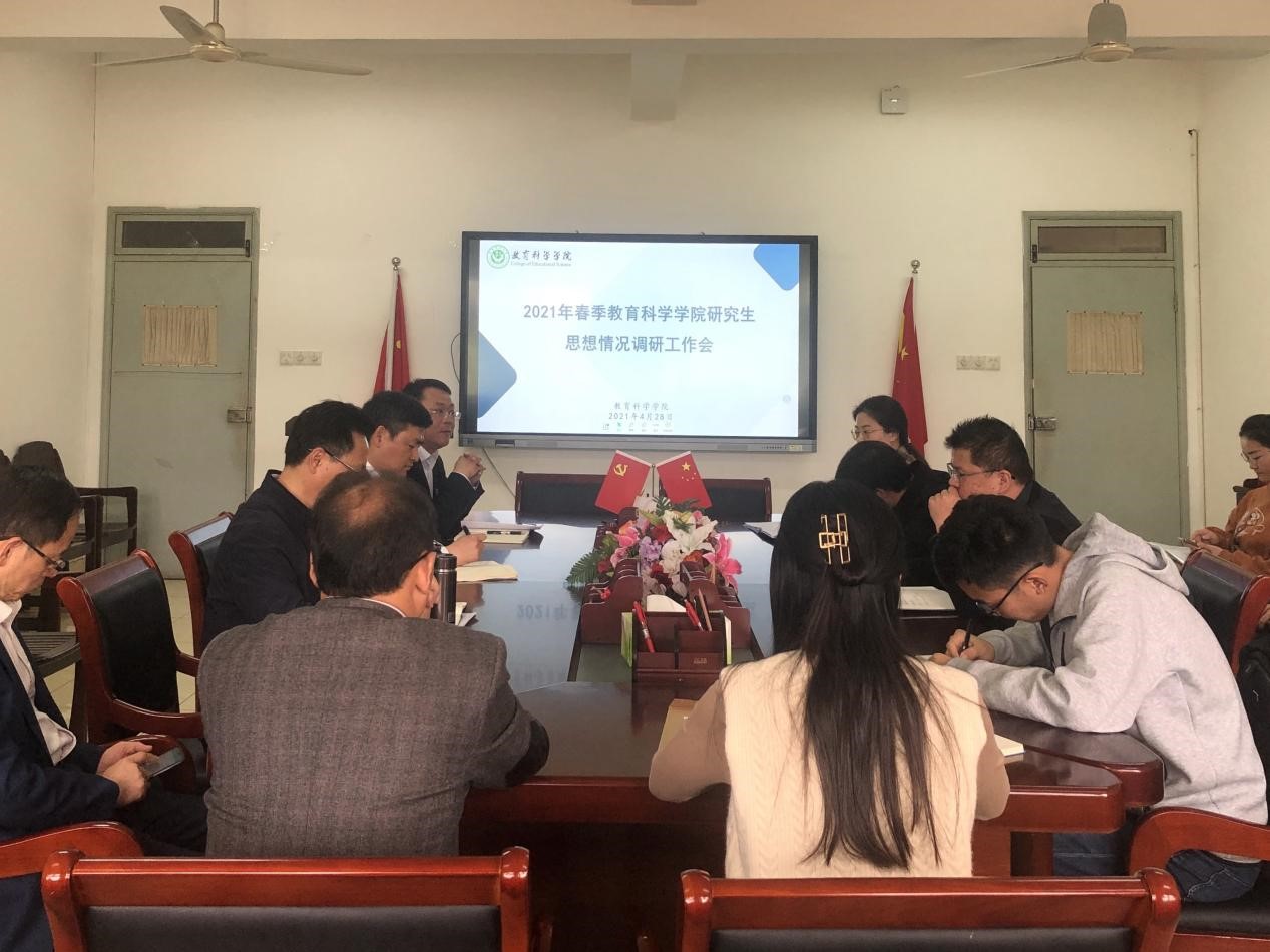 本网讯(文/唐小菲 何亮 图/唐小菲)为充分了解新学期研究生思想动态和学习生活情况,扎实推进学院研究生教育管理服务工作,4月28日下午4时,2021年春季教科院研究生思想情况调研工作会在学院308会议室举行。学院党委书记方泓、院长李宜江、研究生工作分管副院长张更立,以及部分导师代表、研究生教务员、辅导员出席此次会议,本次会议由研究生工作分管副院长张更立主持,30余名研究生代表到场参会。
