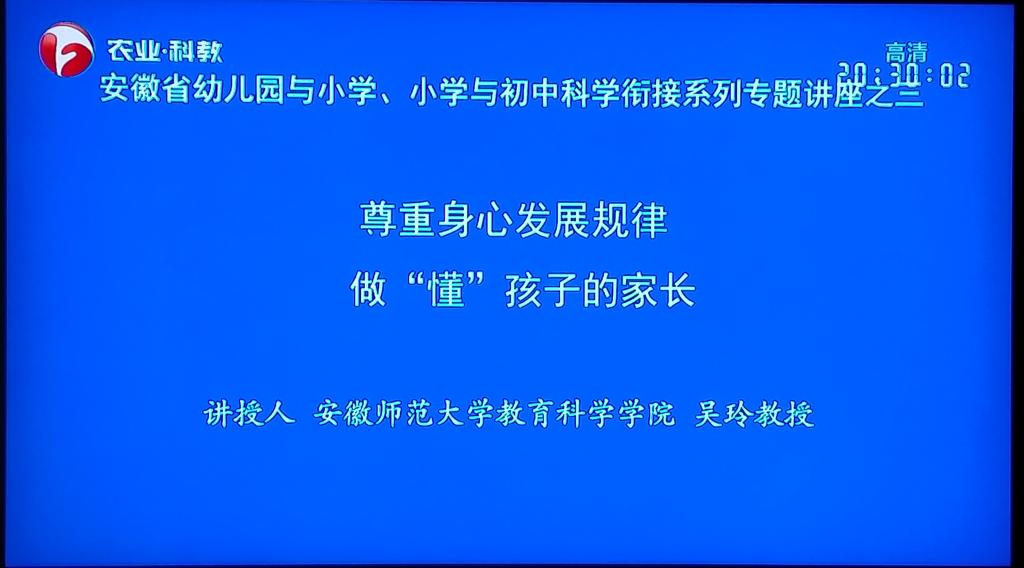 本网讯(教科院)为贯彻落实《教育部关于大力推进幼儿园与小学科学衔接的指导意见》(教基〔2021〕4号),安徽省教育厅专门组织录制了幼小衔接、小初衔接共四期专题讲座视频,并于7月22-25日通过电视频道和网络平台同步播出,全省900多万学生家长受益。我校365英国上市官网吴玲教授应邀参加视频录播工作,主讲第三讲《尊重孩子身心发展规律 做“懂”孩子的家长》。