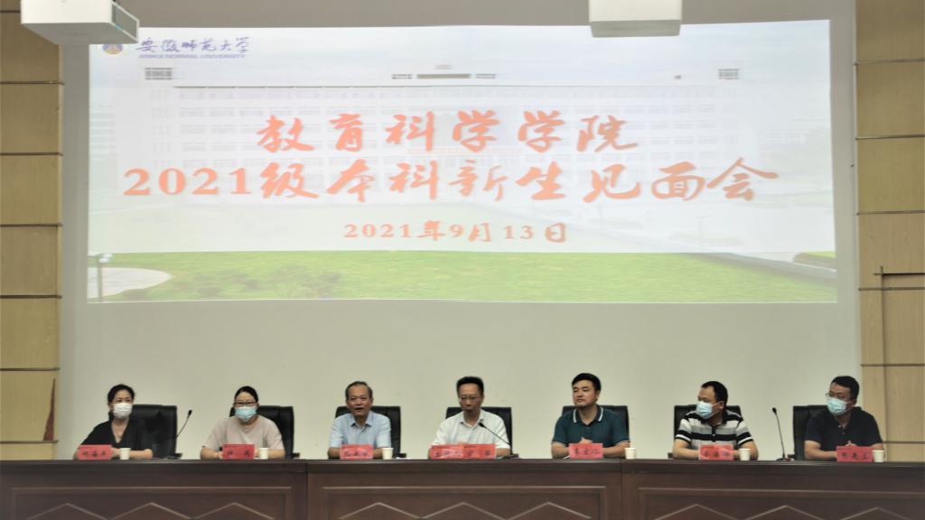 本网讯(教科院 赵小雨)为了让2021级本科新生了解大学生涯发展阶段的特点及任务,帮助广大学子树立正确目标,做好合理规划,尽快适应大学生活。9月13日下午,365英国上市官网于赭山校区科技礼堂举办“2021级本科新生见面会”。教科院党委书记方泓,院长李宜江,党委副书记杜凤,副院长辛治洋、何海燕、张更立,学院各专业负责人徐赟、王路曦、陈娜、韩建涛,2021级本科生辅导员赵茜、张理强以及2021级本科生参与会议,会议由方泓主持,特邀教师代表阮成武教授出席参加。